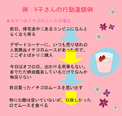 | 次に、どこで太る原因を作っているかを発見しよう。 例を見てわかるように、前日にイチゴムースを買っていなければ余計に食べずに済んだのじゃ。 お腹が空いている時に買い物に行って、余分な食べ物を買いこむのは”太る自分”を作る大きな原因になる。”会社帰りになんとなくコンビニに行く’‘、”目のつく場所に食べ物を置いておく”などというように、最終的に‘食べる’につながる行動は要注意じゃよ。結果的に、食べてしまうだろうと予想のつくことはしないように。自分の側に食べ物がなければ絶対に食べることはないじゃろ。このような‘買い癖’のある人は、ちょっと行動をなおしただけでダイエット成功の第1歩が踏み出せるはずじゃよ。 最後は、ゆったりとした気持ちでダイエットに望むことじゃ。人間は食欲と戦っても、必ず負けてしまうものなのじゃよ。無理に食欲を抑えれば抑えるほど、それが大きなストレスになる。すると、そのストレスを解消するためにドカ食いするという悪循環が生まれるのじゃ。食べることは、手軽なストレス解消法。だから、「食べたい!」と思ったら、本当に空腹なのか、それとも心が欲しがっているだけなのかを見極める必要がある。食べること以外の、ストレス解消法をみつけることもダイエットを成功させるポイントじゃよ。 |