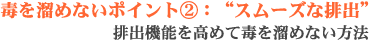 | デトックスとは、“解毒・浄化”体の中の毒素を排出させる新健康法 デトックスは、“解毒”や“浄化”という意味で、体の中に溜まっている毒素を排出させるという新しい健康法です。 これまでは、サプリメントなどの体に良いとされるものを積極的に摂取する“プラスの健康法”が主流でした。 しかし最近の研究で、体に不要なものが溜まっていると、せっかく体に良いものを摂取してもうまく機能しないことがわかってきたのです。 さらに毒素は、私たちの健康を脅かす生活習慣病にも関係しているとも言われています。 要らないものを出して体をキレイな状態に戻す“マイナスの健康法”、デトックスで心も体もスッキリさせましょう。 |